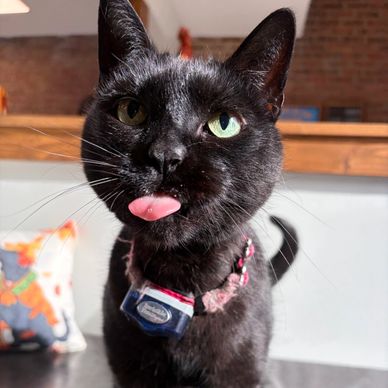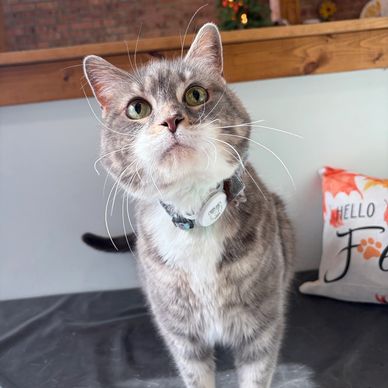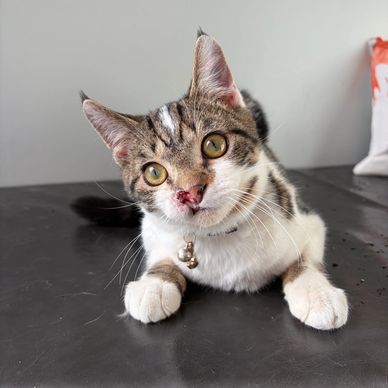 Loco is our three-legged clinic cat. She is VERY mischievous and spends most of her time eating treats and pestering the other cats. You can often catch her running around the clinic and saying hello to our new visitors in the hallways.